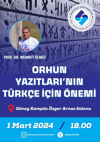 The Significance of the Orhun Inscriptions for the Turkish Language 19 September 2025 / Comments Submitted by admin on 19 September 2025 Etkinlik Tarihi 1 Mar 2024 - 20:00 Event Period 2023-2024 / Spring Semester