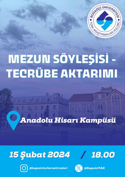 Mezun Söyleşisi - Tecrübe Aktarımı 19 September 2025 / Comments Submitted by admin on 19 September 2025 Etkinlik Tarihi 02/15/2024 - 20:00 Etkinlik Dönemi 2023-2024 / Bahar Dönemi